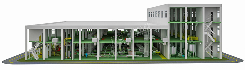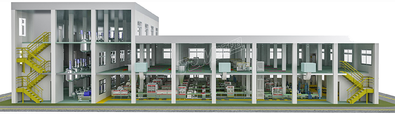 3、車間前道加工:局部三層。三層主要作為物料的暫存和投料區域,二層主要作為復配區域,一層為砂磨和過濾區域。本車間呈立體化設計布局及充分利用高低位差布置,有效提高了生產效率,減少能耗、車間用地。