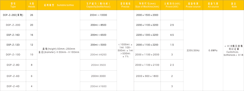 | 生產能力(1L計) | 1800瓶/時 | 2400瓶/時 | 3000瓶/時 | 3600瓶/時 | 4800瓶/時 | 6000瓶/時 |